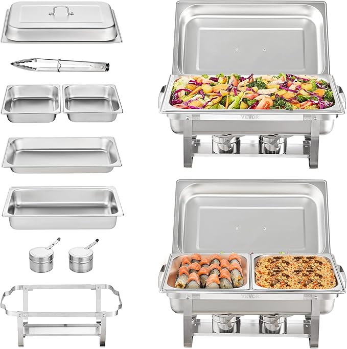 - Warm and Fresh: VEVOR’s 2-pack chafing dishes allow you to maintain the temperatures of all your favorite foods. Supported by fuel holders, our dish can heat various foods while maintaining their fresh taste. Besides, you can also add ice to the water tray to keep foods cool.