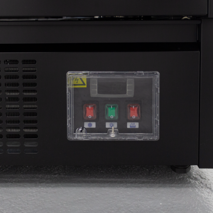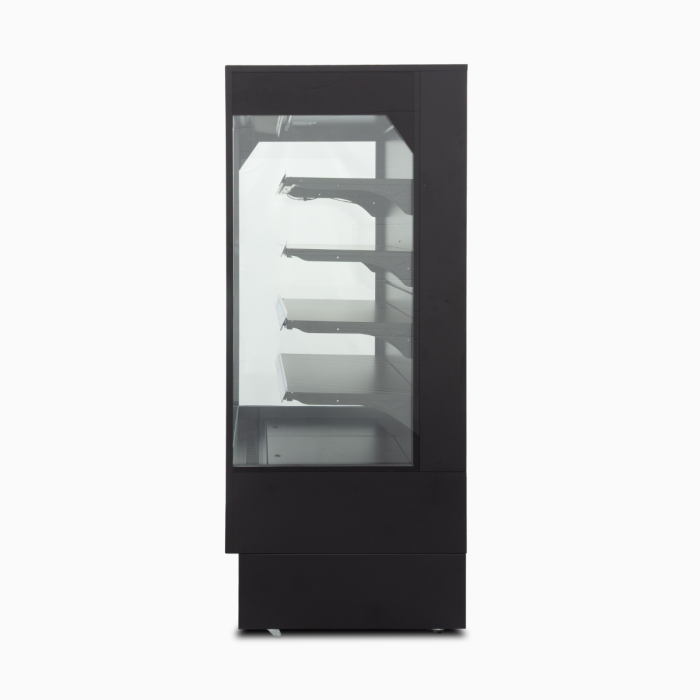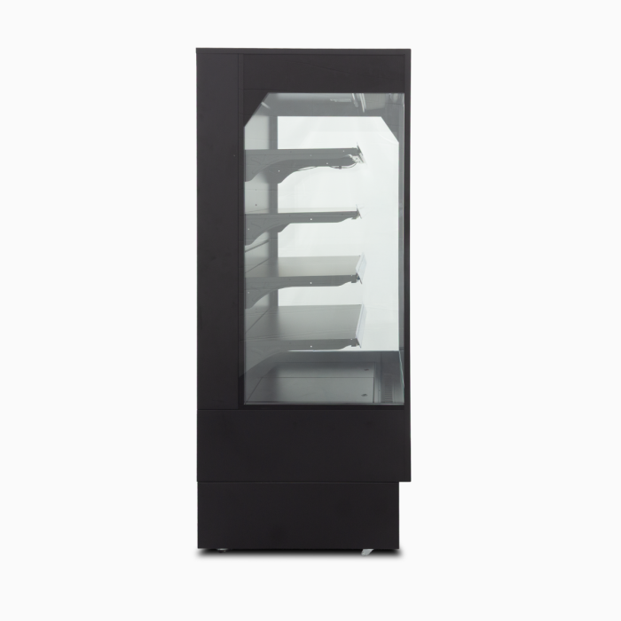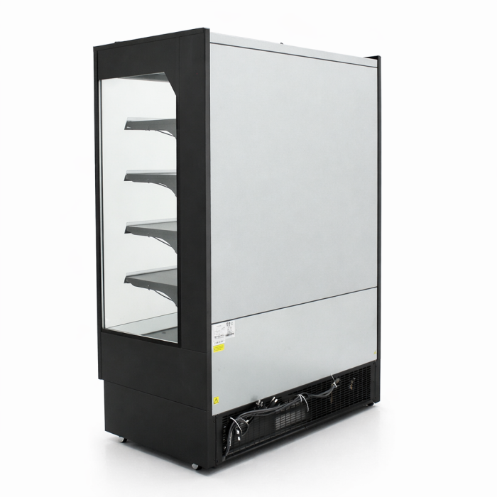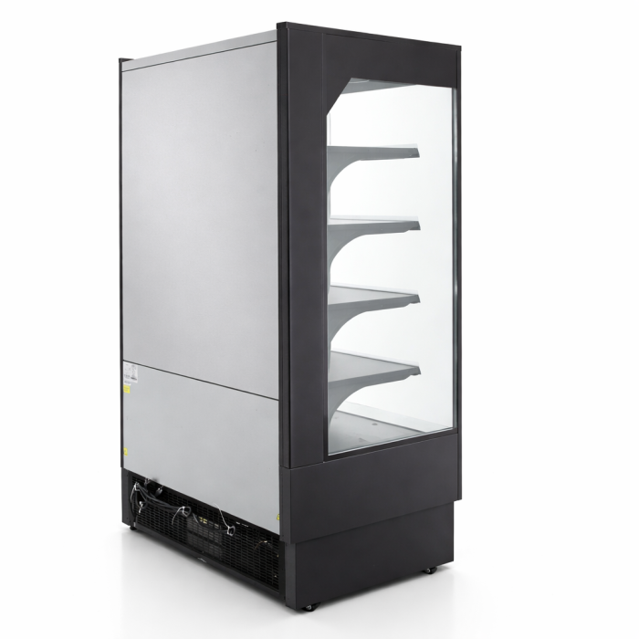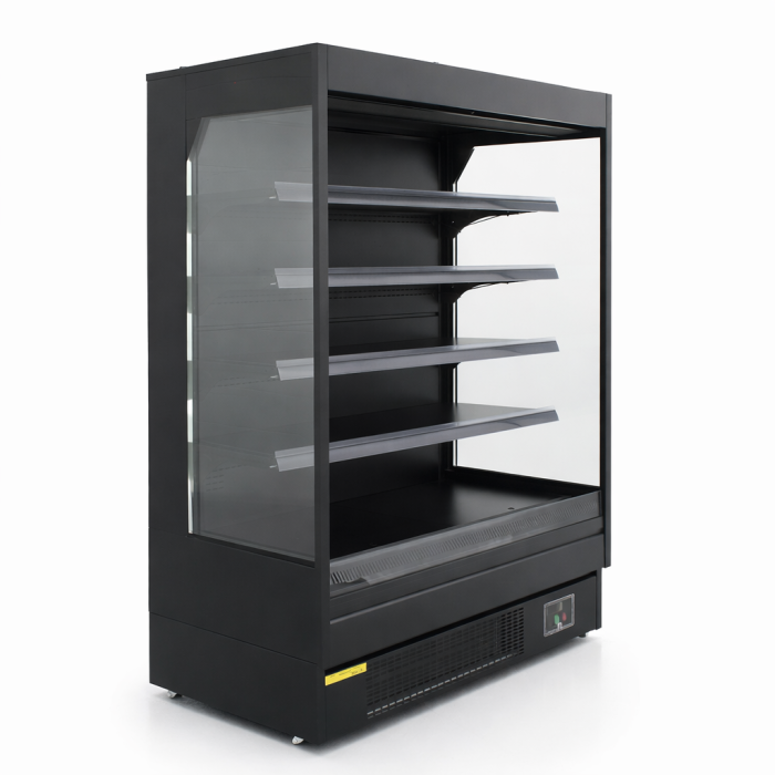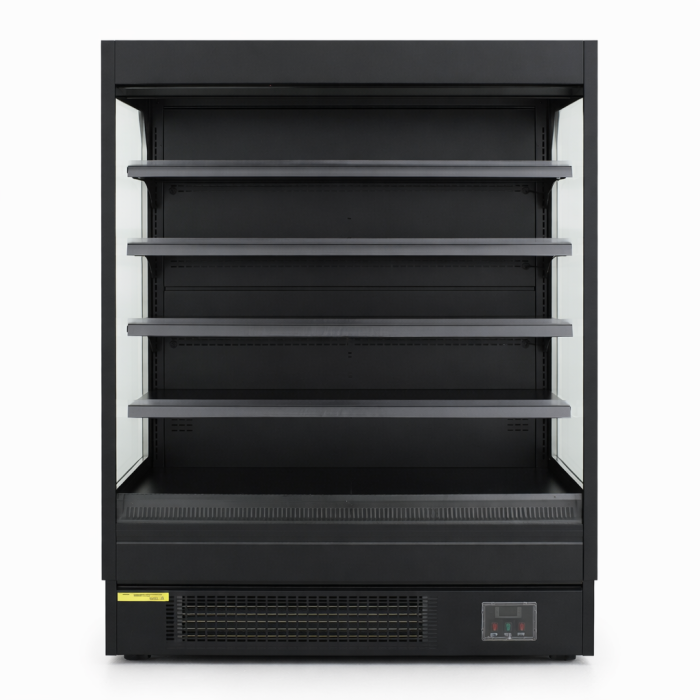 Precision series 40” wide open air merchandiser. These feature BRIGHT LED lights on the interior , Self contained refrigeration system and very efficient cooling with R290! These all black open air coolers feature 3 interior shelfs plus the coolers floor , for a total of 4 display shelfs . These also have a night curtain and come on casters Standard 115 volt plug Ready to use !
